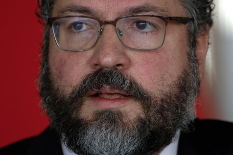 epa07538089 Brazil’s Foreign Minister Ernesto Araujo speaks with the media after a meeting with his Germany’s counterpart Mass, at the Itamarati Palace in Brasilia, Brazil, on 30 April 2019. Maas discussed the situation in Venezuela and the EU-MERCOSUR agreement with Araujo. EPA/Joedson Alves